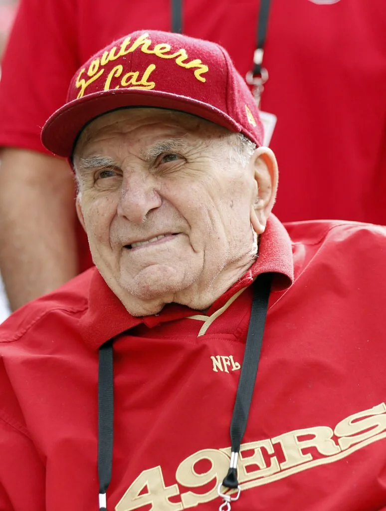 In this Sunday, Oct. 21, 2018, file photo, former San Francisco 49ers player Paul Salata is seen before an NFL football game between the 49ers and the Los Angeles Rams in Santa Clara, Calif. Salata, who created the Mr. Irrelevant Award that honors the last selection of the NFL draft, after playing football at Southern California and in the NFL and Canadian Football League, died Saturday, Oct. 16, 2021. He was 94.