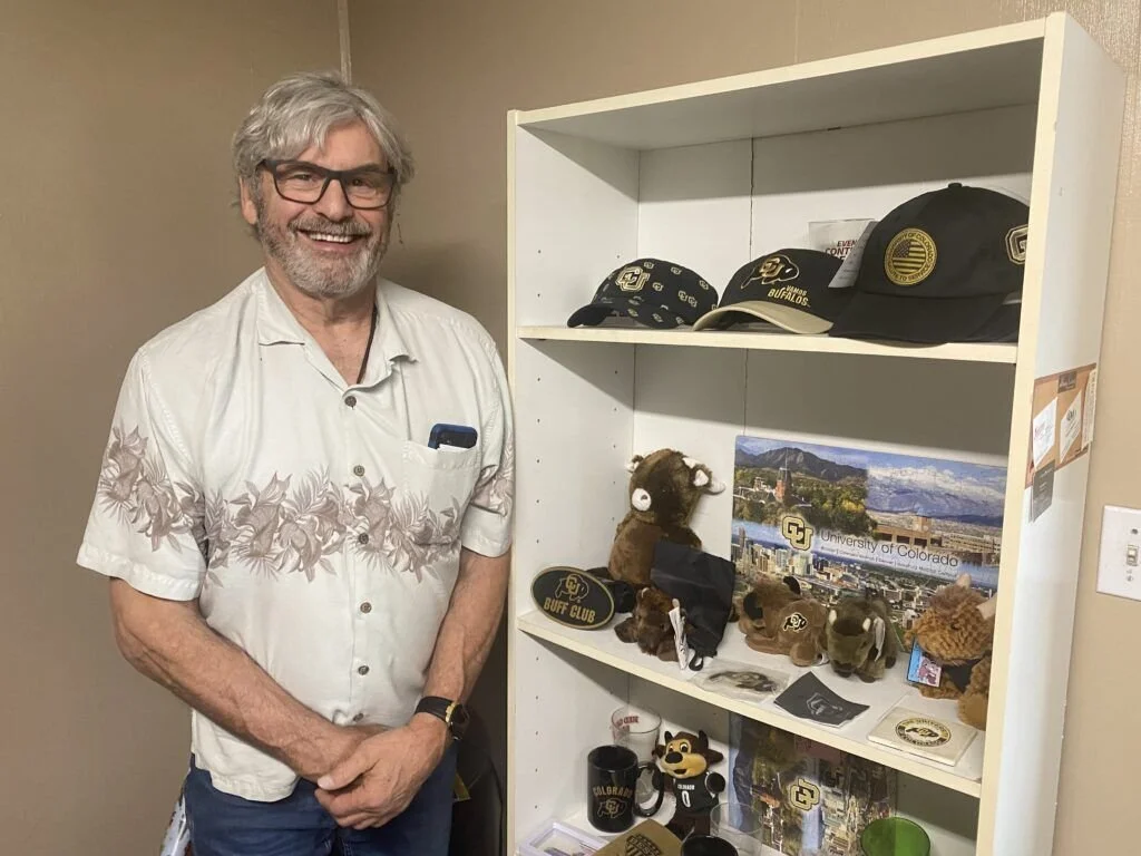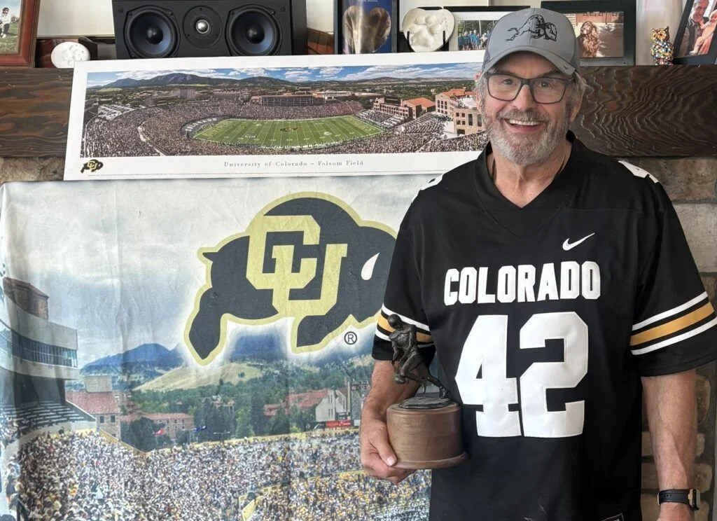 A former Colorado standout, Jim Kelleher was the final pick and Mr. Irrelevant in the 1977 NFL Draft. He now owns Top of Rockies, a marketing and apparel firm in Denver. Here he’s shown in March 2026 with the Lowsman Trophy.