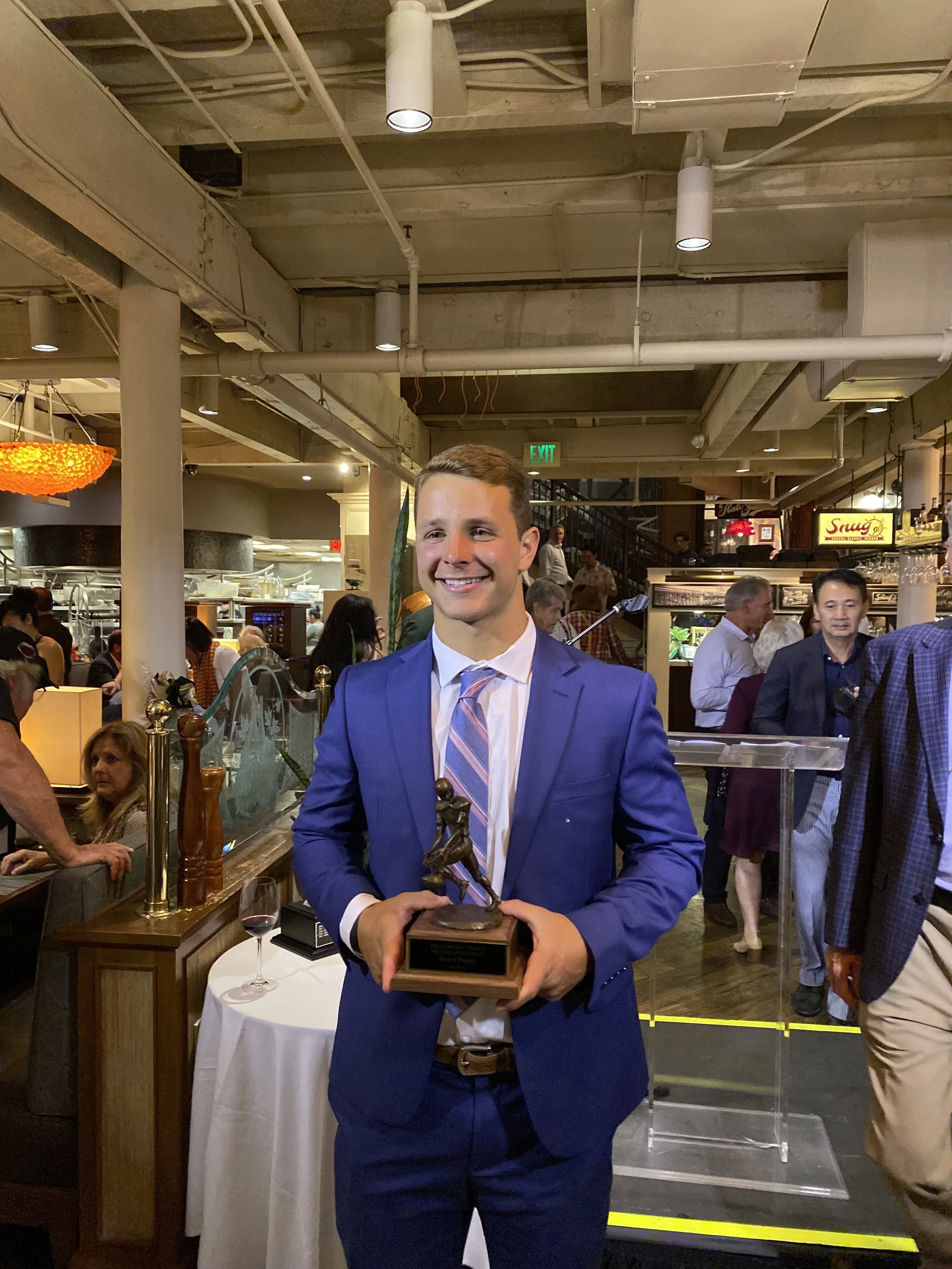 San Francisco quarterback Brock Purdy, who is, by far, the most successful “Mr. Irrelevant,” poses with the Lowsman Trophy after being selected with the final pick in the 2022 NFL Draft.