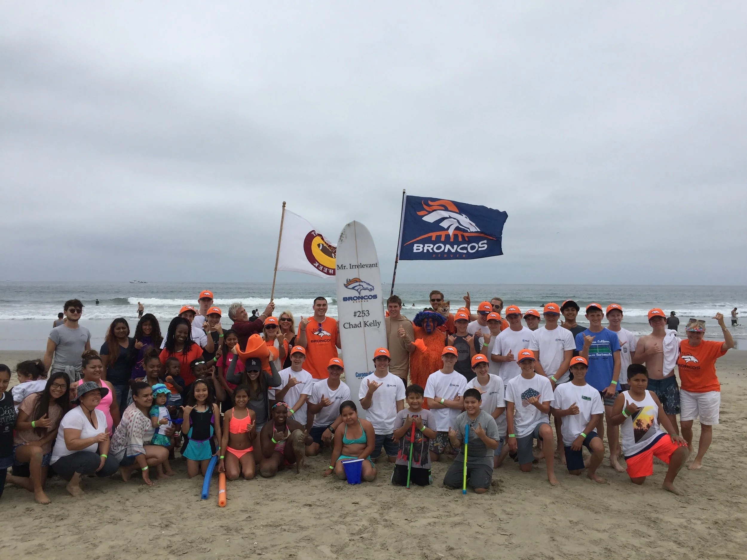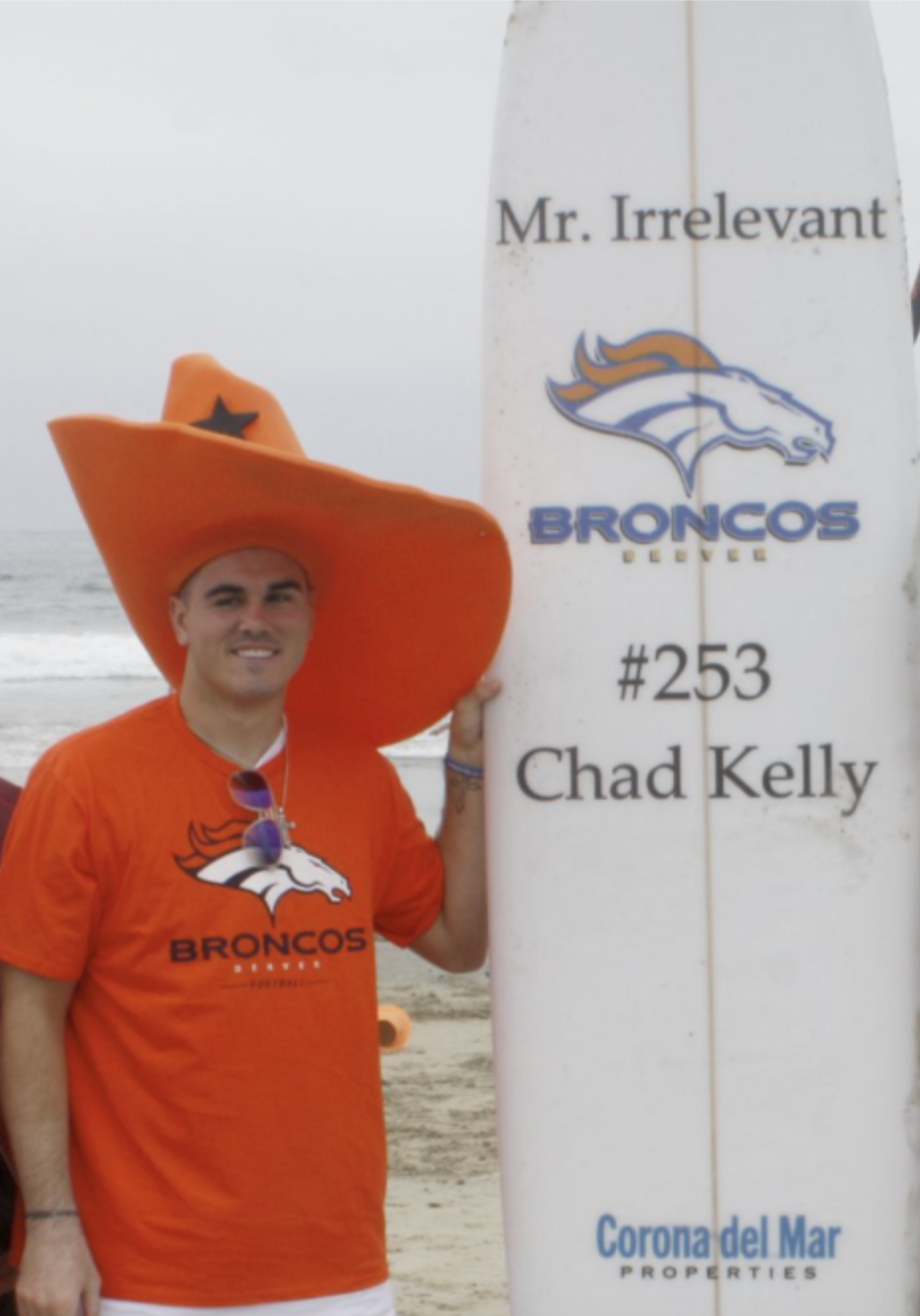 Ex-Broncos quarterback Chad Kelly poses with a surfboard in Newport Beach, Calif., as part of Irrelevant Week festivities in 2017.