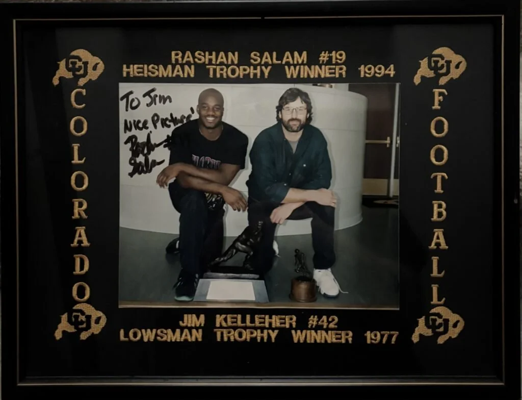 A former Colorado standout, Jim Kelleher was the final pick and Mr. Irrelevant in the 1977 NFL Draft. He now owns Top of Rockies, a marketing and apparel firm in Denver. Here he’s shown with the Lowsman Trophy alongside CU icon Rashaan Salaam and Salaam’s Heisman Trophy.