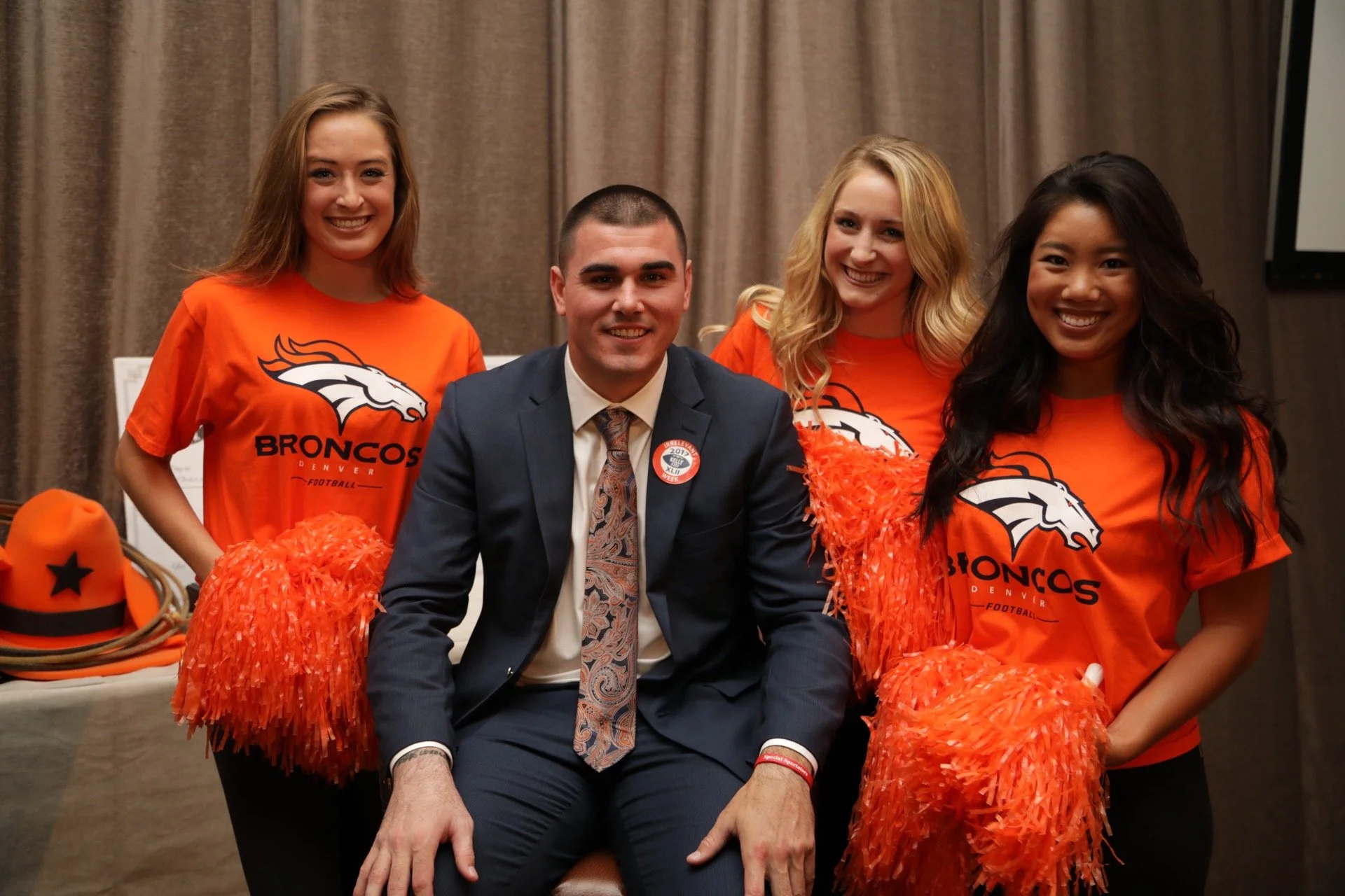 Former Mississippi quarterback Chad Kelly poses with Broncos cheerleaders after being selected as Mr. Irrelevant with the final pick of the 2017 NFL draft.
