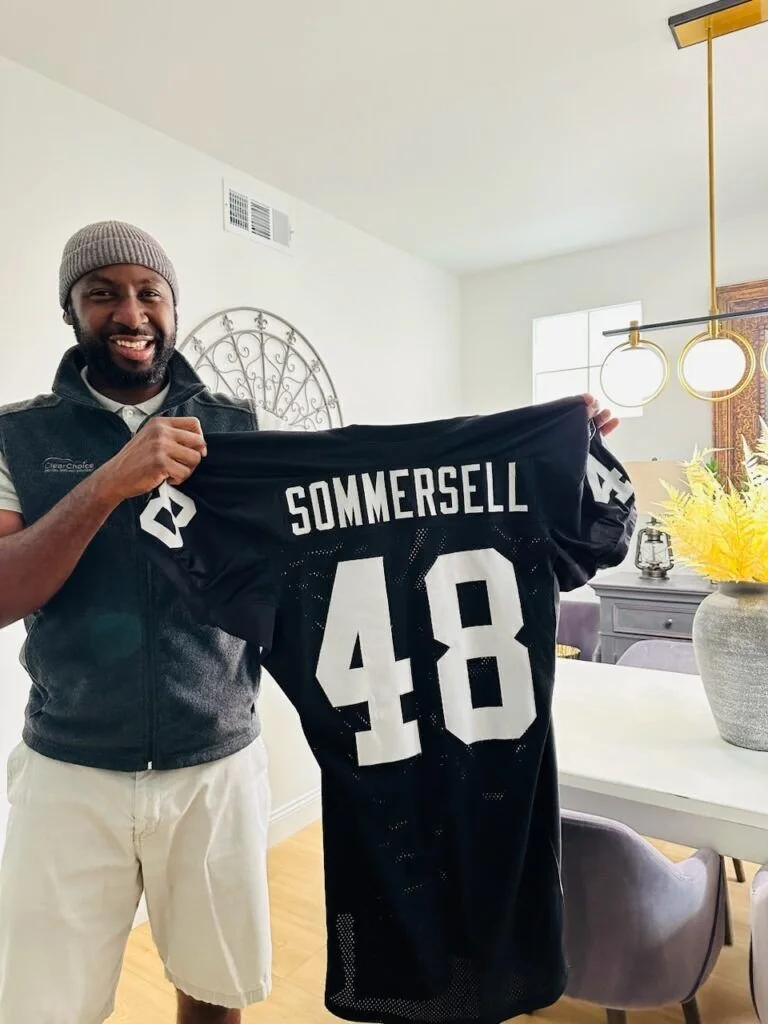 Former Colorado State linebacker Andre Sommersell poses with a Raiders jersey in 2024. He was Mr. Irrelevant after being Oakland’s selection with the final pick of the 2004 NFL Draft.